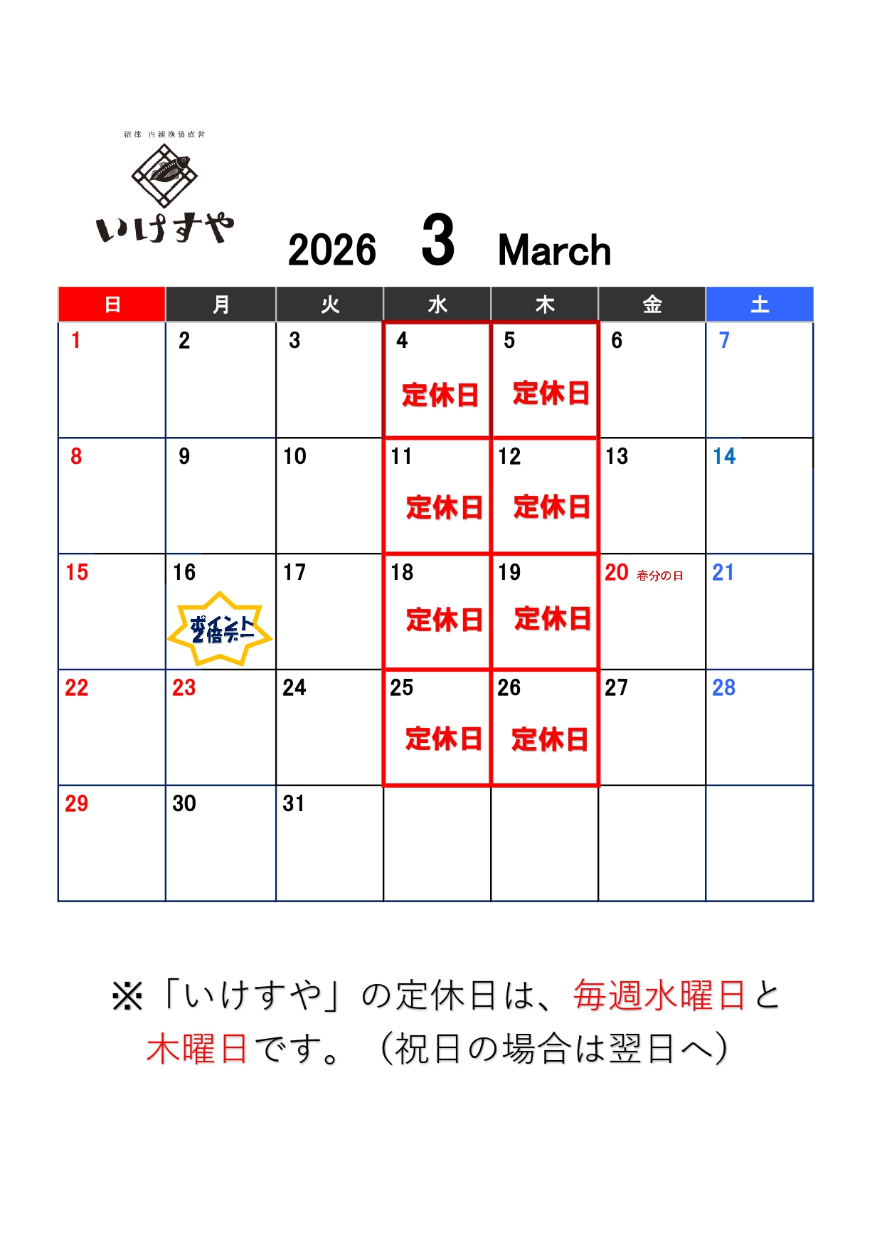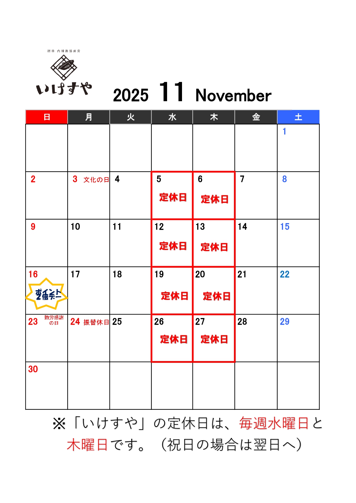 いけすや食堂メニュ-・臨時変更のお知らせ