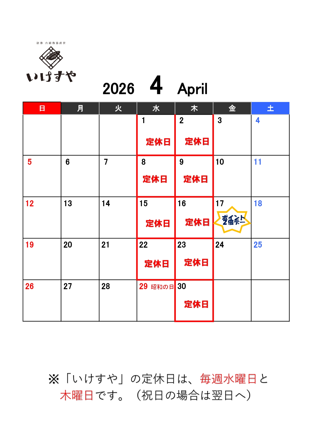 【4月の営業カレンダー】